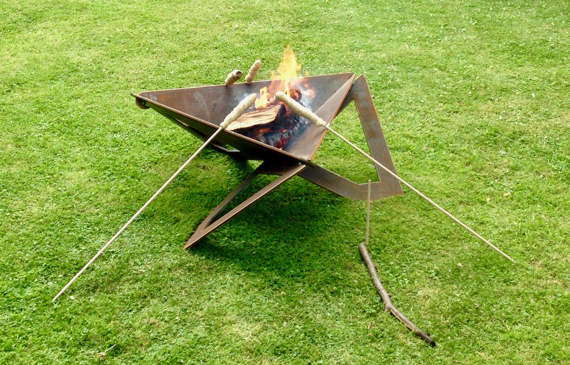 Wunderschöne handgefertigte Feuerschale für den Garten. Dreiteilige Feuerschale mit Ausschnitten an den Seiten. Sie ist nicht verschweißt und kann einfach zusammengesteckt und nach der Nutzung wieder zerlegt werden. Diese Feuerschale ist aus Schiffsbaustahl. Sie rostet unter Witterungseinflüssen und hat somit eine begrenzte Lebensdauer, welche je nach Beanspruchung 10 Jahre oder länger betragen kann.